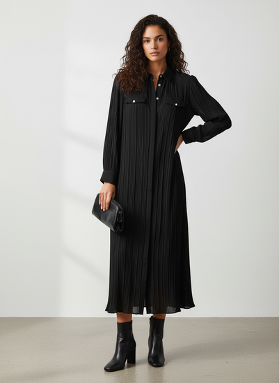 Description : New with tags ZARA long-sleeved black pleated maxi shirt dress with two button-flap chest pockets and a collared neckline.