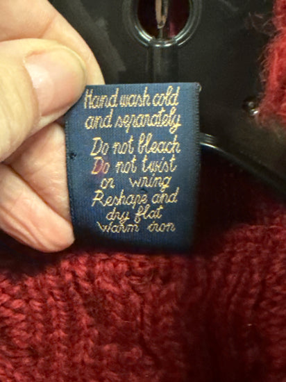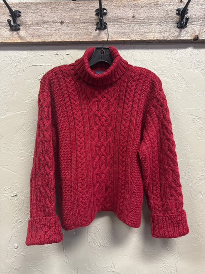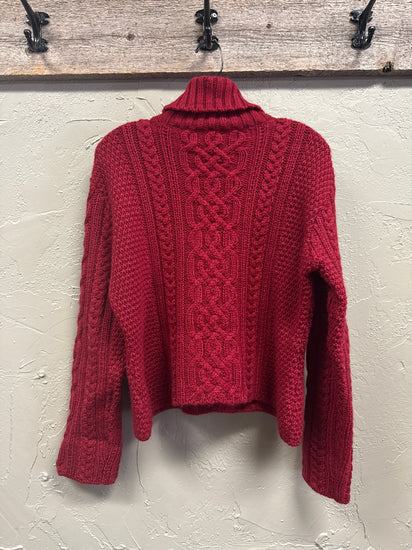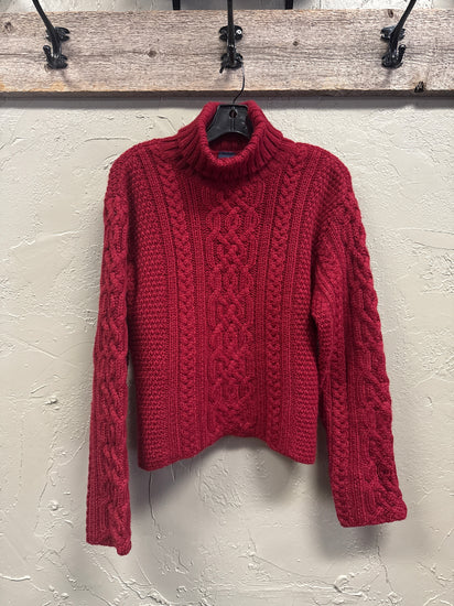 Description : Chunky cable-knit turtleneck sweater in a deep raspberry red with prominent braided cable patterns down the front and along the sleeves, ribbed turtleneck collar, and a slightly cropped hem.