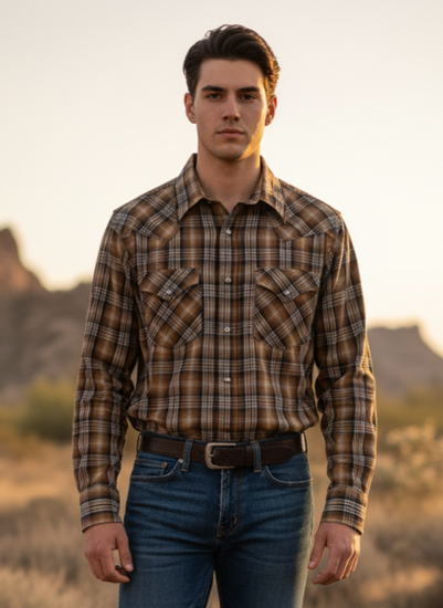 Description : PENDLETON FRONTIER, brown plaid pearl snap shirt with two chest pockets and a western design