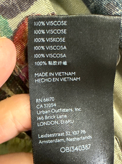 Description : Long-sleeve button-up shirt in mixed prints: camo shoulders and sleeves, a leopard-print panel on the left front, and a floral panel with pink, purple and blue blooms on the right front, featuring two chest flap pockets and a slightly worn, patchwork aesthetic.