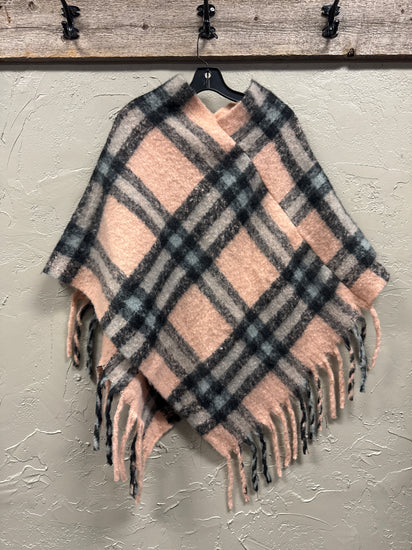 Description : Pink, black, and grey plaid poncho with fringe detailing along the hem. It features a V-neck opening and a soft, textured fabric