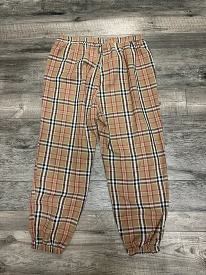 Description : Casual elastic-waist plaid pants in a camel base with a classic tartan pattern featuring black, white and red stripes, side pockets, and gathered elastic cuffs. The fabric is medium-weight with a relaxed, tapered jogger silhouette