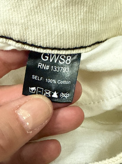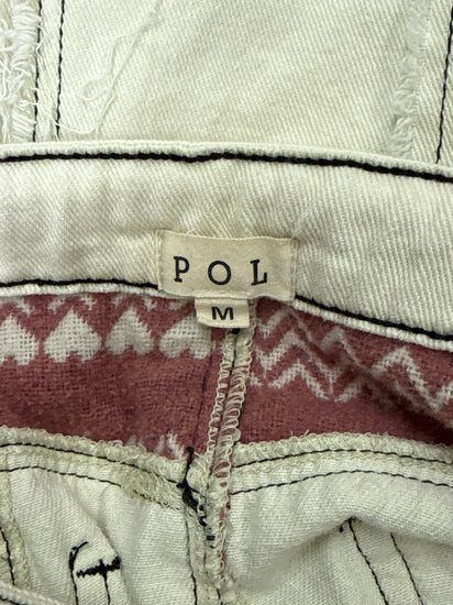 Description : Cream-colored denim maxi skirt with contrasting dark stitching, featuring two zippered pockets and decorative embroidered patches with hearts and geometric patterns on the sides. The hem is frayed, and it has a drawstring waist.
