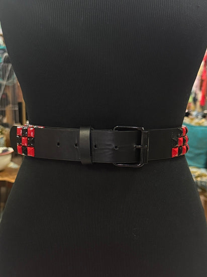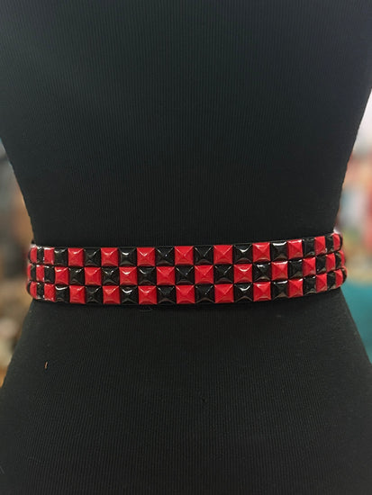 Description : Take that classic studded belt look one notch further with this black and red version. Features black hardware.