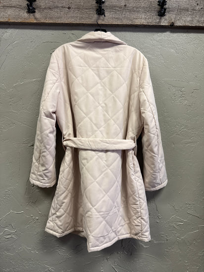 Description : Quilted belted longline coat with a wide shawl collar, long sleeves, diamond stitching and a self-tie waist belt; open-front style with a slightly padded texture. Visible features include knee-length hem, relaxed fit and horizontal seam detailing at the shoulders.