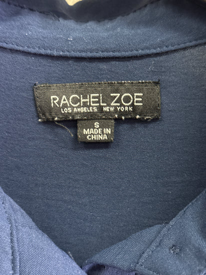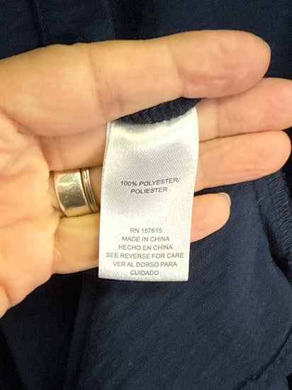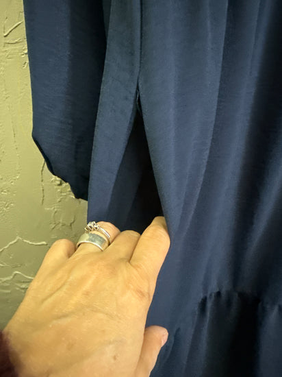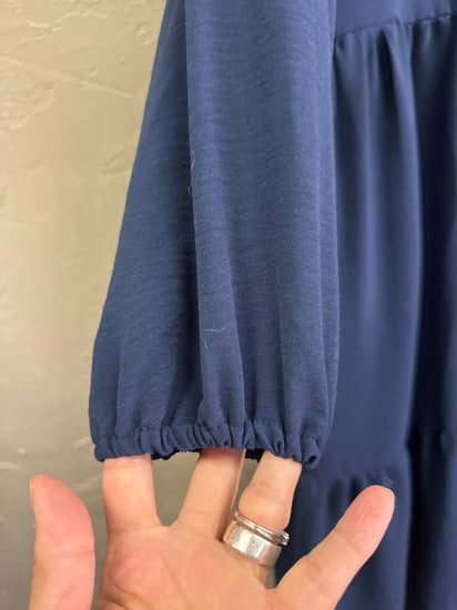 Description : Maxi dress in a deep navy blue with a collared, button-front bodice, long sleeves with slightly gathered elastic cuffs, and a tiered, gathered skirt creating a flowing silhouette. The fabric is slightly textured and lightweight.