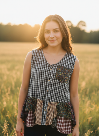 Description : Sleeveless tunic-style top in a black-and-white plaid with a front button placket and a multicolored floral patch pocket on the left chest. The hem is ruffled and patchworked with contrasting plaid, gingham, and floral panels in burgundy, tan, and green tones.