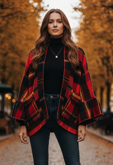 Description : A red and black plaid open-front cardigan with yellow accent stripes, featuring long bell sleeves and front patch pockets, completely one of a kind, created from a vintage blanket.