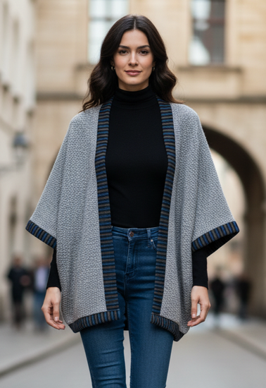 Description : Batwing jacket in a textured light grey, wool-like knit with wide dolman sleeves and a striped navy and black trim along the open front, cuffs, and hem; relaxed and boxy silhouette Completely one-of-a-kind out of deadstock fabric