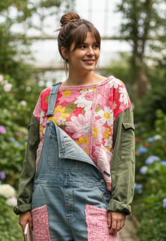 Description : Remade quilted top with a bright pink floral front panel featuring large white and yellow flowers, center exposed seam and pink patch pockets; sleeves and side panels are olive green with rolled cuffs. The neckline is wide and the hem has a slightly frayed, handmade finish