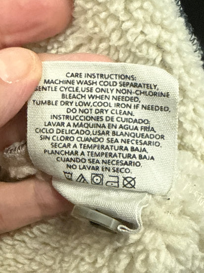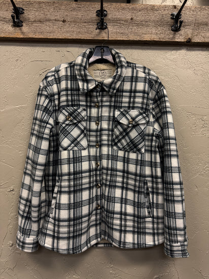 Description : Plaid fleece shacket in black, white, and gray, featuring a collared neckline, button front, two chest pockets and a sherpa lining