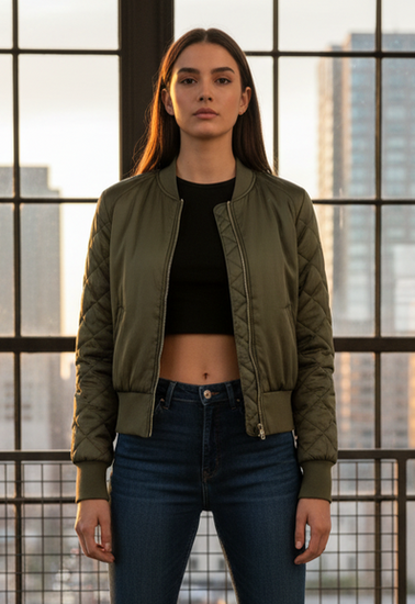 Description : Army green bomber jacket with a front zipper, ribbed collar and hem, quilted sleeves, and angled front pockets.