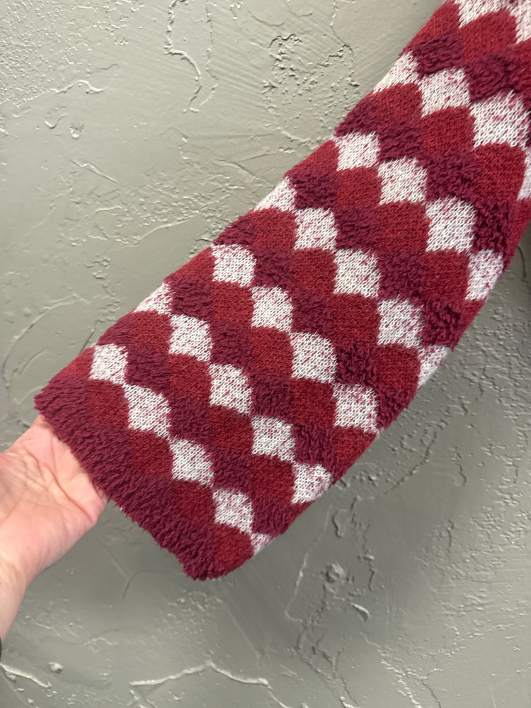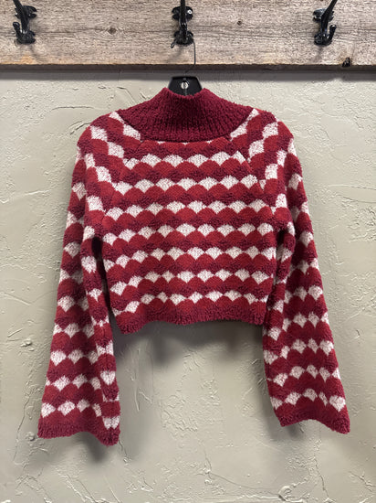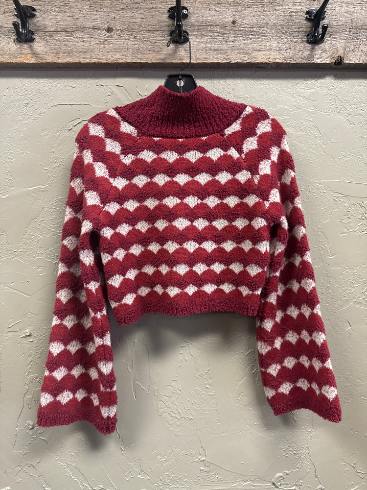 Description : Cropped long-sleeve knit sweater in a deep berry red with a high ribbed mock neck and an all-over scalloped white pattern; textured, slightly loose sleeves and a boxy short hem
