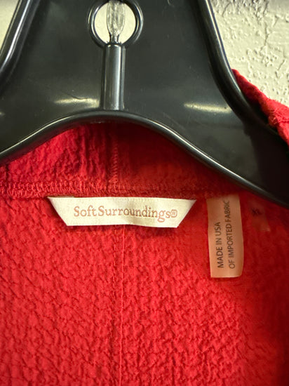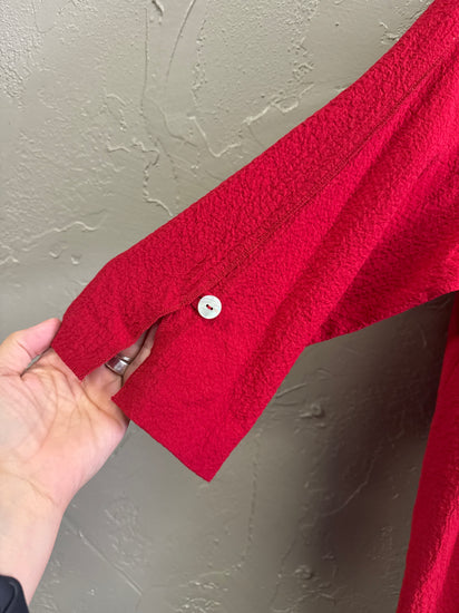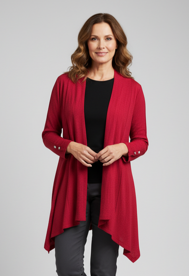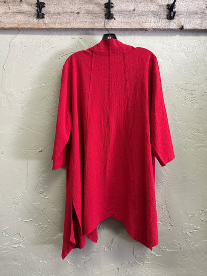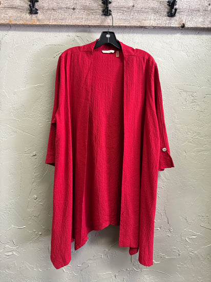 Description : Long open-front cardigan in a vivid red with a crinkled textured fabric, draped asymmetric hem and loose 3/4-length sleeves with single button detail. The piece is collarless and flows open without closures for a relaxed, layered look.