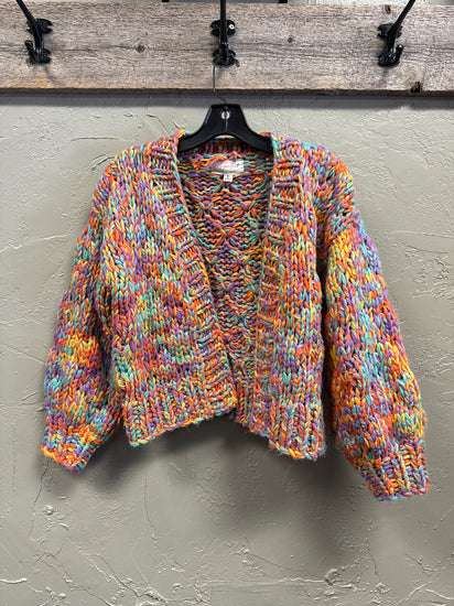 Description : Chunky knit cardigan in a multicolored yarn, featuring a relaxed fit with wide sleeves and an open front