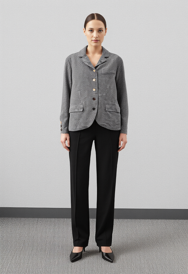 Description : Features include a notched lapel, and two front flap pockets, with an additional small pocket on the upper left side. The jacket has a relaxed cut and long sleeves with button details at the cuffs.