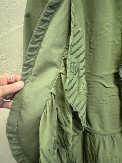 Description : SUNDANCE olive green jacket with a dark green collar and pocket trim. It features decorative buttons on the cuffs and a ruffled, patterned hem.