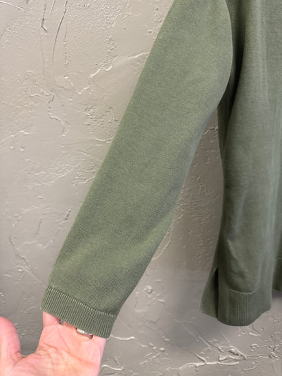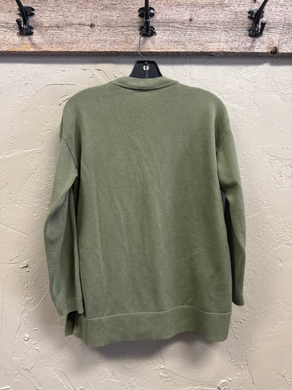Description : Long-sleeved olive green V-neck cardigan with a button-up front and ribbed cuffs and hem