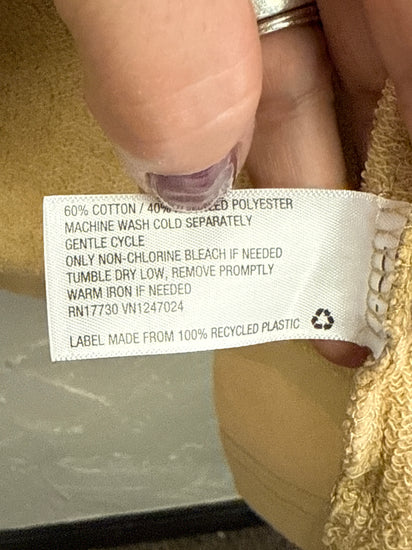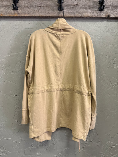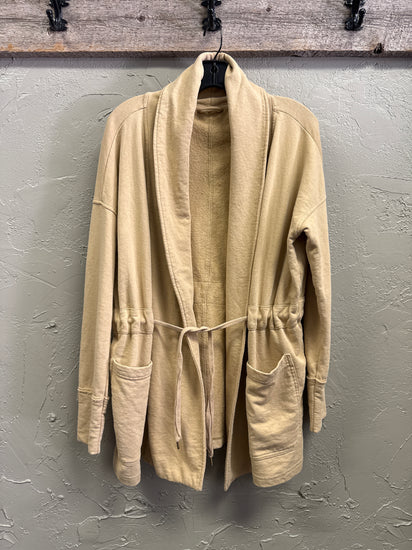Description : Light tan open-front cardigan or sweatshirt jacket with a shawl collar, long sleeves, and a drawstring waist. Front patch pockets and a relaxed, slightly slouchy cotton-fleece fabric give it a casual, cozy look
