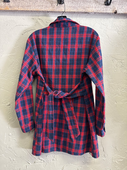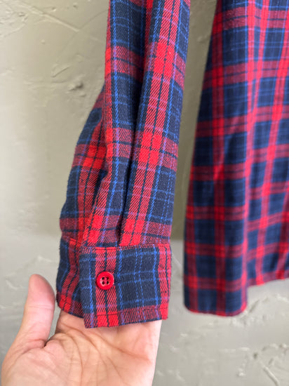 Description : Long button-up plaid shirt in red and navy blue with a spread collar, long sleeves with cuffs, and a full-length front button closure; the fabric is soft and slightly brushed. The pattern is a bold check with evenly spaced vertical and horizontal lines