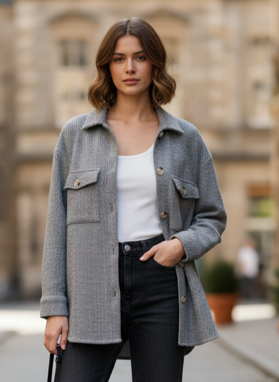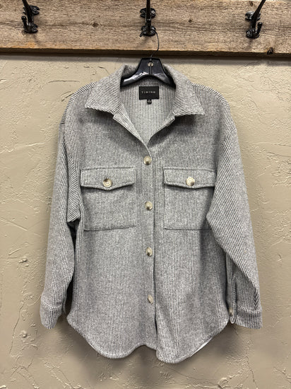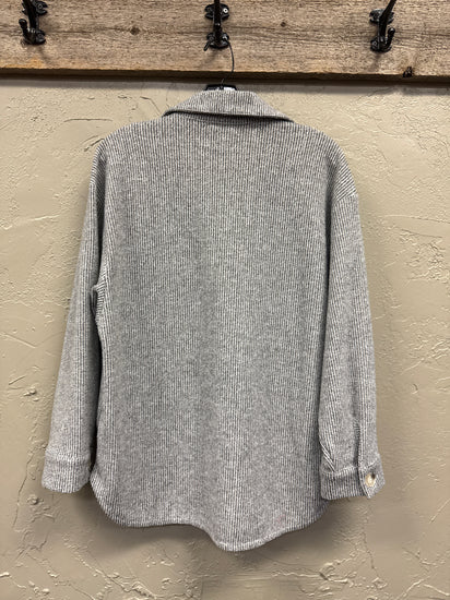 Description : Grey, striped heavy flannel shirt with two chest pockets and a button-up front.