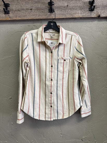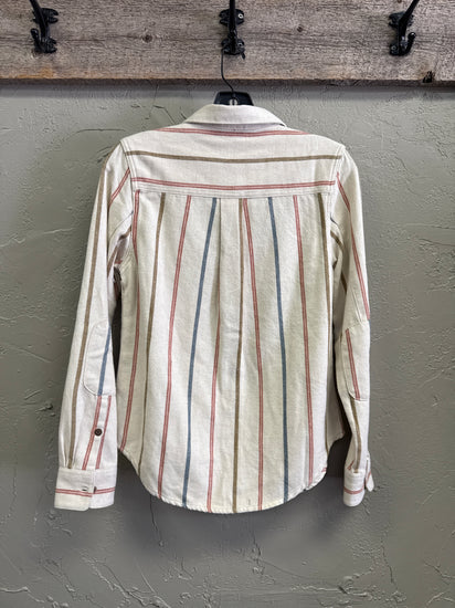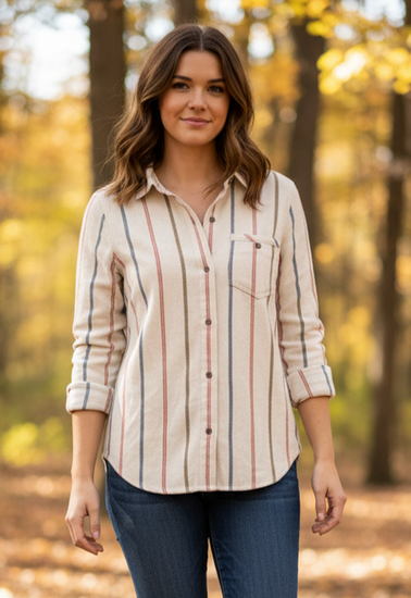 Description : Long-sleeve button-up flannel shirt in a cream base with vertical muted stripes in rust red, olive, and dusty blue; features a pointed collar, front button placket and a single chest pocket. The fabric is soft and slightly textured with a relaxed, casual fit