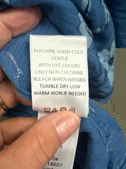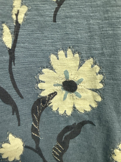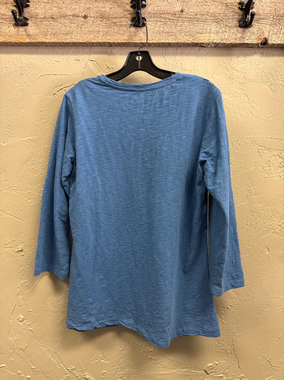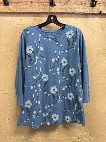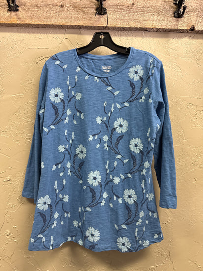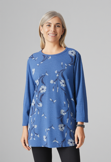 Description : Blue long-sleeve floral tunic featuring a round neckline, 3/4 length sleeves and a slightly curved hem.