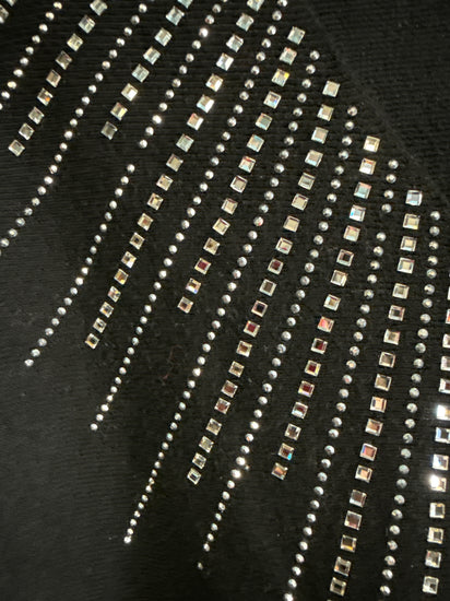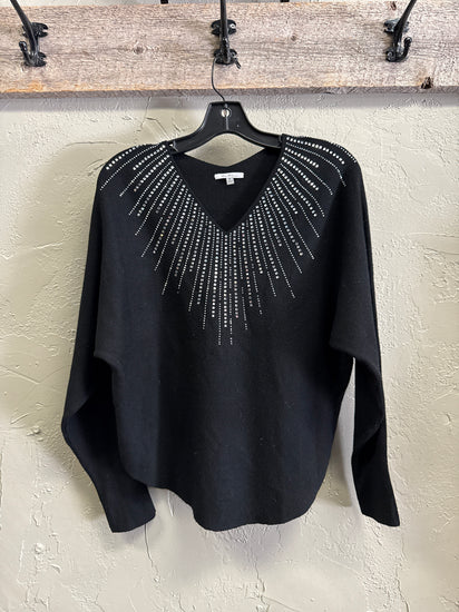 Description : Black long-sleeve pullover sweater with a V-neck, featuring radiating silver rhinestone embellishments around the neckline and a relaxed, slightly boxy fit from the front