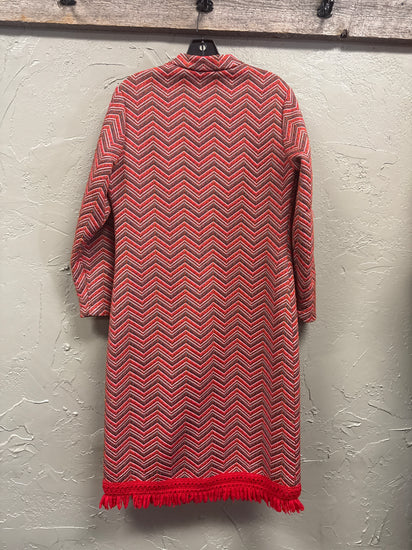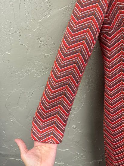 Description : Vintage long-sleeve, knee-length sheath dress with a front center zipper and high round neckline, featuring a textured chevron zigzag pattern in red, gray, beige and dark accents and a red fringe trim at the hem. The piece appears woven/knit with a slightly structured vintage silhouette