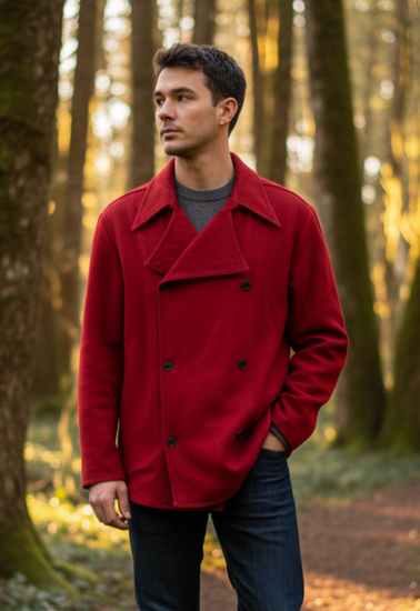 Description : Vintage red double-breasted wool shirt/short coat with a wide pointed collar, long sleeves, and six visible dark buttons; slightly loose, boxy silhouette with a smooth wool texture.