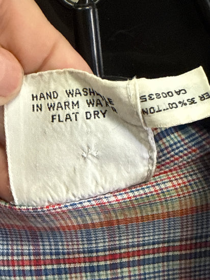 Description : Vintage long-sleeve collared plaid button-up shirt in soft pink, blue and white tones with a partial button placket, single chest pocket, and lightweight cotton-like fabric.