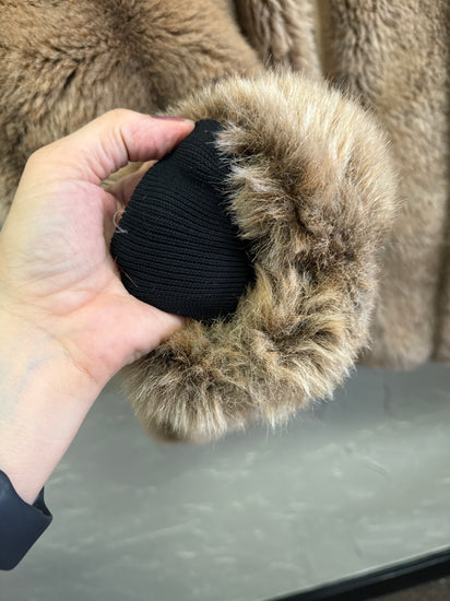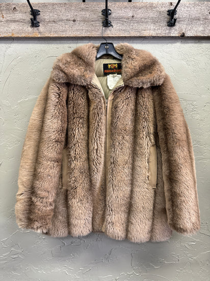 Description : Vintage faux fur goose-down coat in a warm light-to-medium tan brown with a plush textured pile, wide folded collar, front zipper closure, and side welt pockets.