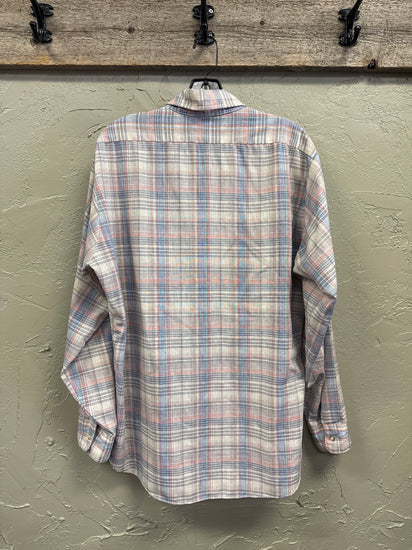 Description : Vintage Levi's long-sleeve shirt featuring a pale rainbow plaid pattern with two chest pockets.