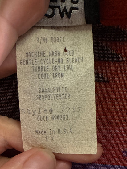 Description : Vintage fleece cardigan in a bold native-inspired print featuring dominant red, purple, black and yellow accents, with a shawl collar and front patch pockets