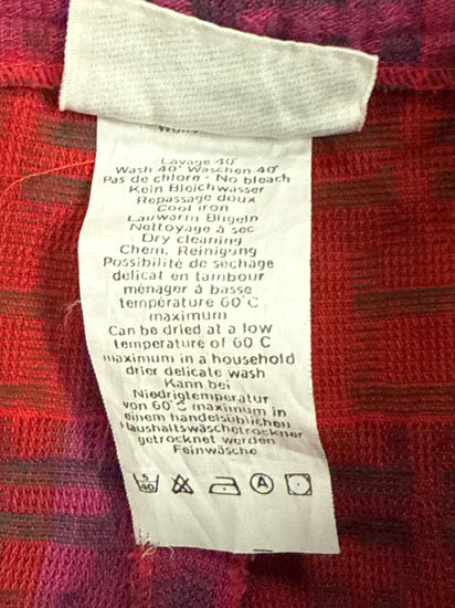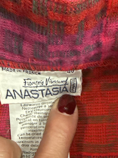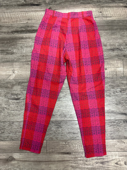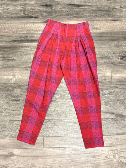 Description : Vintage 1980's ANASTASIA PARIS (designed by Francois Viannay) cotton blend pleated trouser. Features a vibrant pattern in shades of red and pink, with a grid-like design incorporating darker hues of purple. A high-waist, and tapered leg makes this the perfect contemporary silhouette.