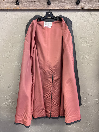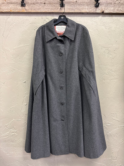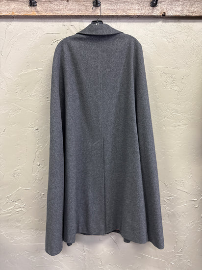 Description : Long wool button-front cape in a deep charcoal gray with a pointed collar, center row of dark buttons and flowing A-line drape; front shows discreet arm openings and clean, minimal seams. The fabric is dense and slightly textured, giving a structured yet elegant silhouette