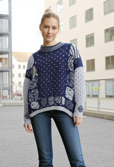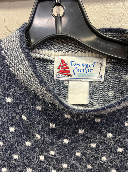 Description : Vintage blue and white sweater, polka dot and patchwork patterns, round neckline, long sleeves, ribbed cuffs and hem, textured appearance with a fuzzy finish.