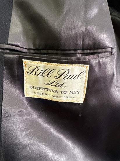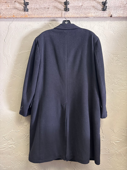 Description : Long vintage cashmere overcoat in deep navy with a notched lapel, three-button front, flap pockets, and a smooth inner lining. The straight silhouette and classic tailoring give it a timeless, formal appearance. Price reflects lining damage