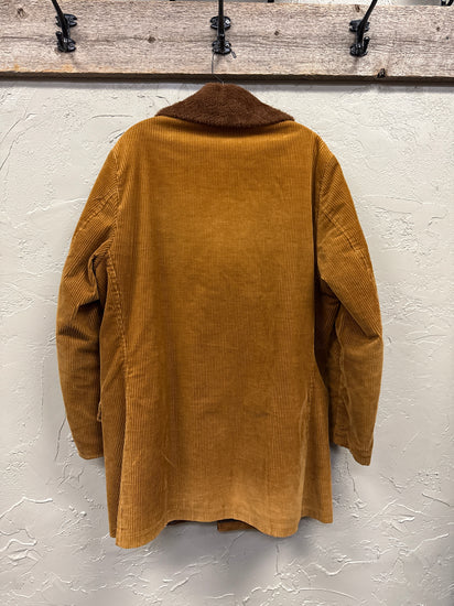 Description : Vintage corduroy jacket with a fuzzy brown collar and two front pockets. It features a button-down closure and brown buttons
