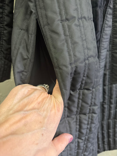 Description : Vintage long black quilted coat with a wide brown fur shawl collar and a self-tie belt at the waist, featuring an A-line silhouette and long sleeves.