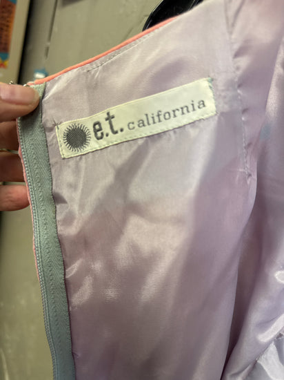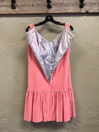 Description : Sleeveless vintage knee-length dress in a warm coral-pink with a V-neck, fitted bust seams and a central row of decorative round buttons; soft A-line shape with subtle side pockets/gathers and a visible back zipper