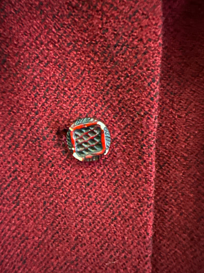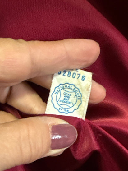 Description : Long A-line wool coat in a deep red hue with a brown fur collar, three front buttons, and slanted flap pockets; mid-calf length with long sleeves and a tailored, vintage silhouette.