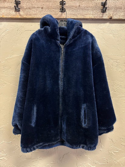 Description : A plush navy faux-fur hooded jacket with a front zipper, long sleeves, and hidden welt pockets. The oversized silhouette shows a soft, glossy pile with elasticized cuffs and hem for a cozy fit.