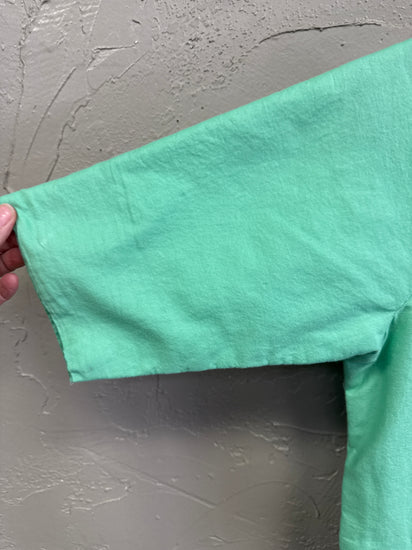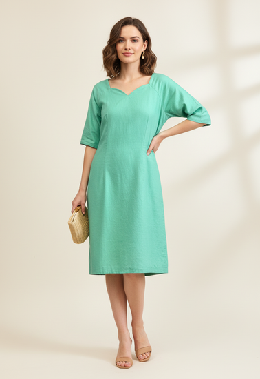 Description : Vintage, knee-length dress in a bright mint green with a sweetheart-like notched square neckline, short sleeves, and simple seaming down the front for light shaping; fabric is lightweight and most likely cotton