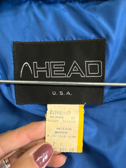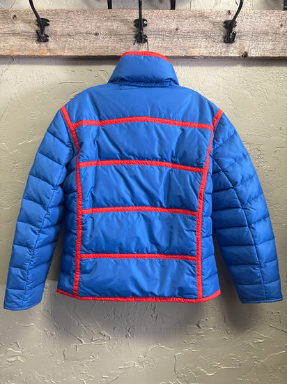 Description : Two-piece snow set with a bright cobalt blue quilted puffer jacket featuring red stitched trim and a front zipper, paired with high-waist bright red insulated snow pants trimmed with cobalt blue panels and vertical piping. Both pieces are padded with a glossy, weather-resistant finish and straight leg pants with blue cuffs.