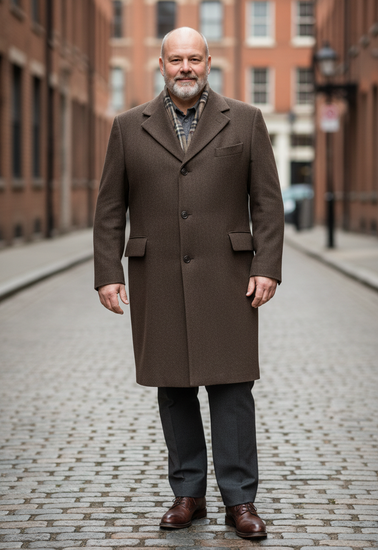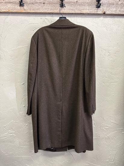 Description : Long single-breasted overcoat in a deep brown wool blend with wide notched lapels, three front buttons and flap pockets at the hips.
