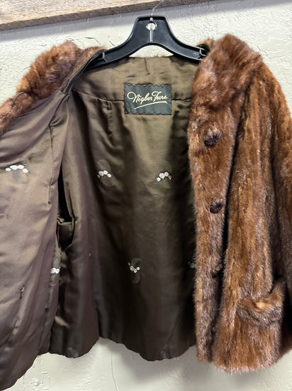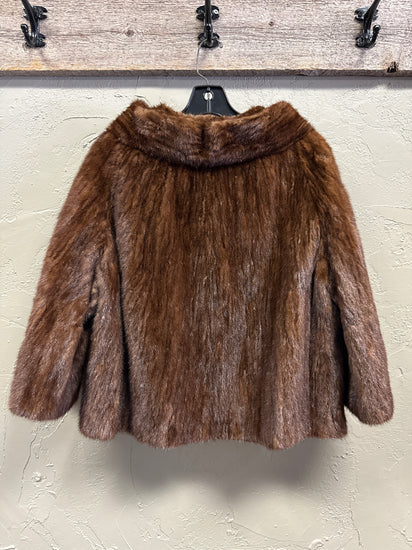 Description : Vintage short fur jacket featuring a shawl collar, four decorative buttons down the front, two flap pockets and 3/4 length sleeves