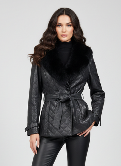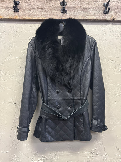 Description : Vintage black quilted leather jacket with a prominent (detachable) black fur collar and a matching tie belt