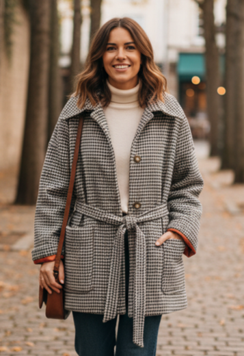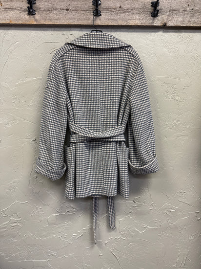 Description : Vintage houndstooth coat in blue, tan and cream with a beautiful rust-orange lining; features a wide pointed collar, two-button front, self-tie belt at the waist and front patch pockets. The textured wool fabric and long sleeves give it a structured, classic silhouette
