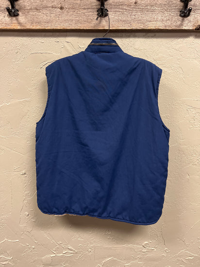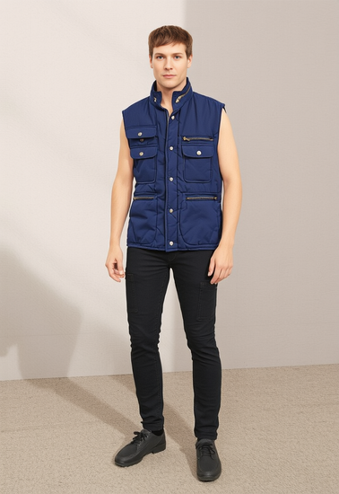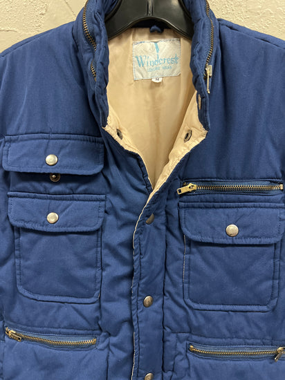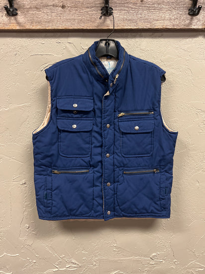 Description : Vintage insulated vest with a stand-up collar, front snap closure. Loaded with pockets - three small flap pockets with snap closures, three zippered pockets and two side pockets.